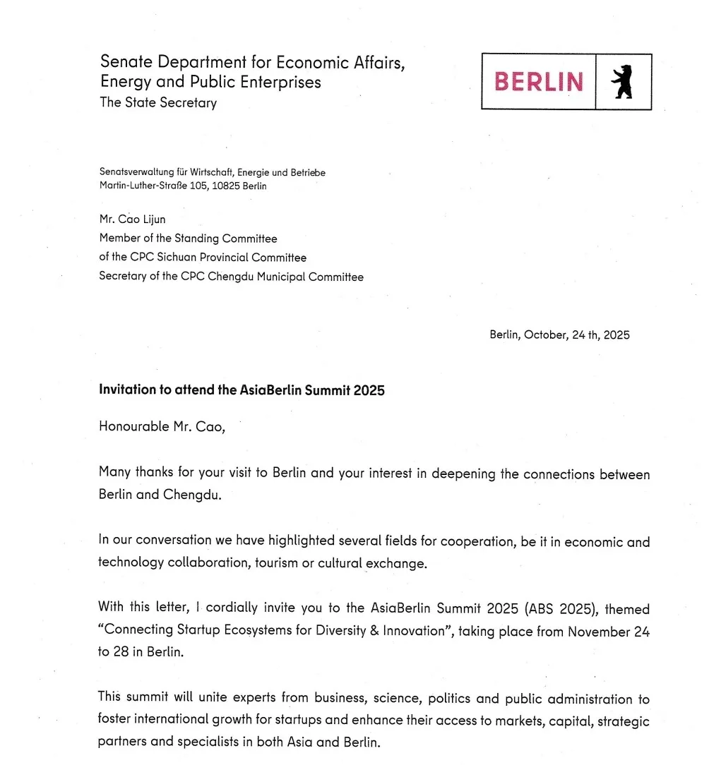 In October 2025, Cao Lijun, Member of the Standing Committee of the CPC Sichuan Provincial Committee and Secretary of the CPC Chengdu Municipal Committee, led a delegation to visit Germany and held talks with Michael Biel, State Secretary for Economic Affairs in the Berlin Senate Department for Economic Affairs, Energy, and Public Enterprises. Both sides reached important consensus on further deepening friendship city relations and strengthening cooperation in sci-tech innovation, economic and trade sectors, cultural and arts, and other areas.