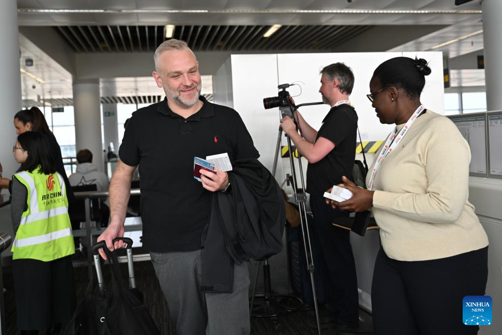 A passenger shows a souvenir received before boarding the inaugural direct flight from Brussels to Beijing operated by Air China at Brussels Airport in Brussels, Belgium, March 24, 2026. Chinese carrier Air China launched a direct passenger service between Brussels and Beijing, China's capital, on Tuesday, and will launch another between Brussels and Chengdu, the capital of southwest China's Sichuan Province, on Thursday, adding new air links between Belgium and China. (Xinhua/Lyu You)